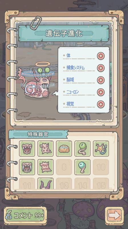 でんでんのステータス横に「+」マークが出ている場合はステータスアップが可能です。進化すると特殊器官が追加されたり、スキルが開放されたりします。