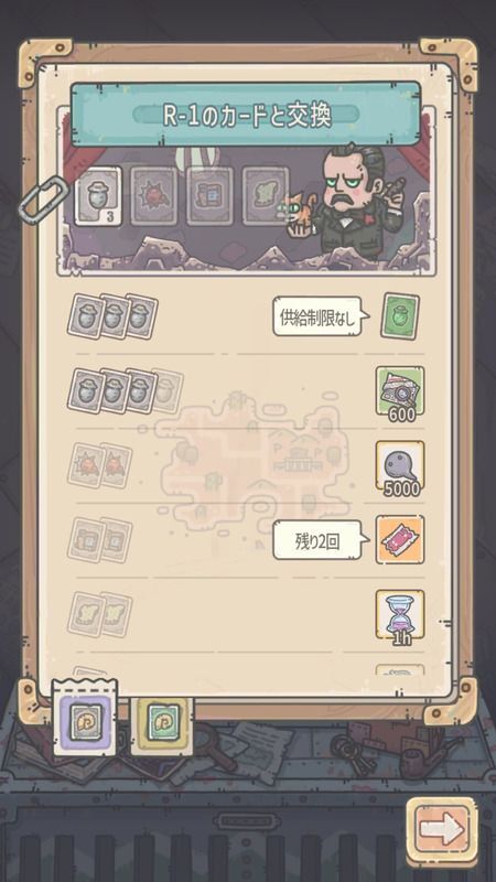 カードを入手したらそれぞれ報酬と交換しましょう。レアリティの低いカードは集めて高レアリティのカードに変換することも可能です。カードは1回の探索終了時に全て精算されるため、次回探索に持ち越しできません。使い切るようにしましょう。端数が余った場合は資源に交換されます。